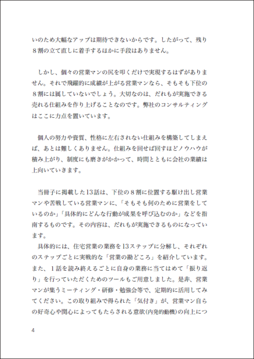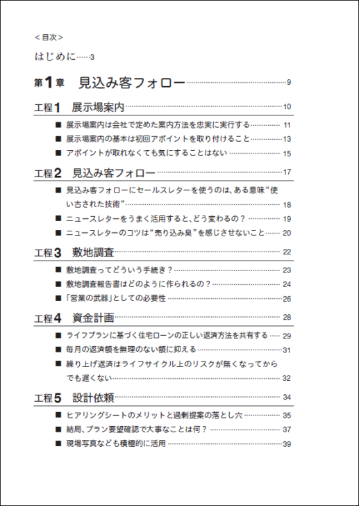 著書【なか見!試し読み】 2020.06.15 お知らせ 住宅営業を 成功に導く 13の勘所 (定価:3,000円+税) 駆け出し営業マンを抱える注文住宅建築業の経営者様へ 住宅営業の業務を13ステップに分解し、 それぞれのステップごとに 実戦的な「営業の勘どころ」を紹介。 営業マンが集うミーティング・勉強会で、定期的にスキルアップのための指導教本としてご活用ください。 【 令和2年6月初版発行 】